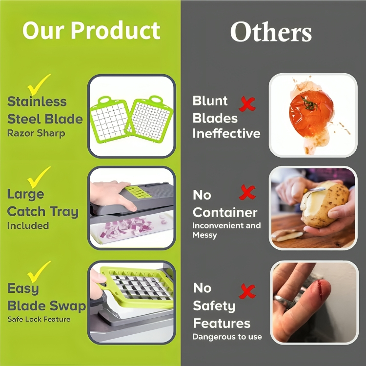 π [Multifunctional] This vegetable chopper contains seven cutting blades and an egg yolk separator, which helps you to cut vegetables and fruits into cubes, shreds, slices and powders easily. The product can be used to cut tomatoes, onions, potatoes, mozzarella, mushrooms, carrots, cucumbers, squash, courgettes, salad and other food.
